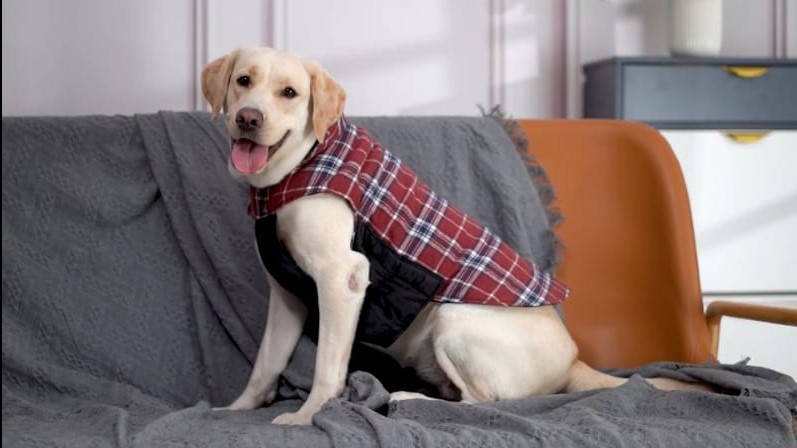 You want a coat that fits and isn’t tight. Clothing shouldn’t restrict your dog’s movement.